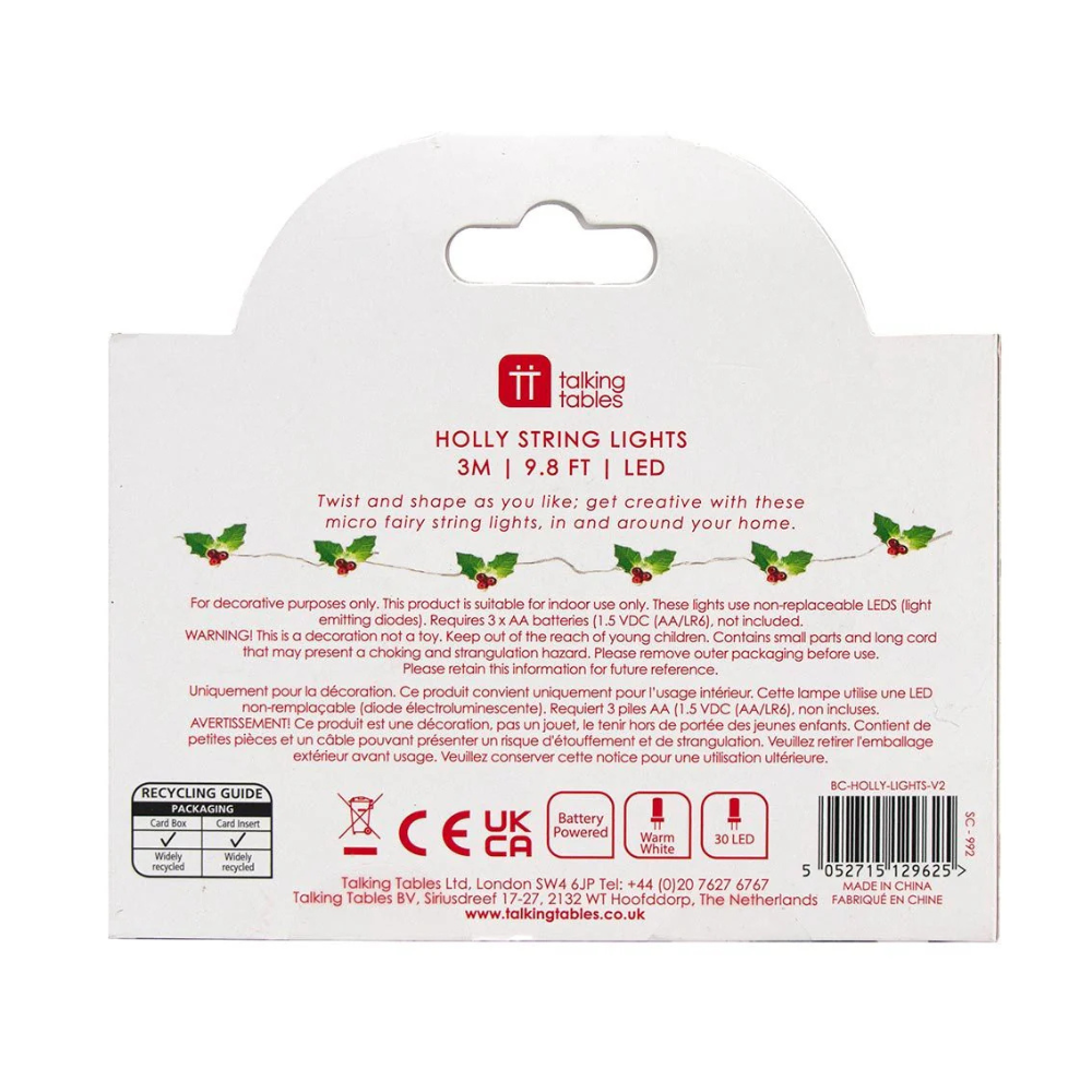 Bring festive sparkle to your home with these green holly string lights. Featuring classic holly leaves with bright red berries, the 3-metre string is lit with warm LEDs to add a cosy glow to your Christmas décor. Perfect for draping across the table, mantel or tree.
